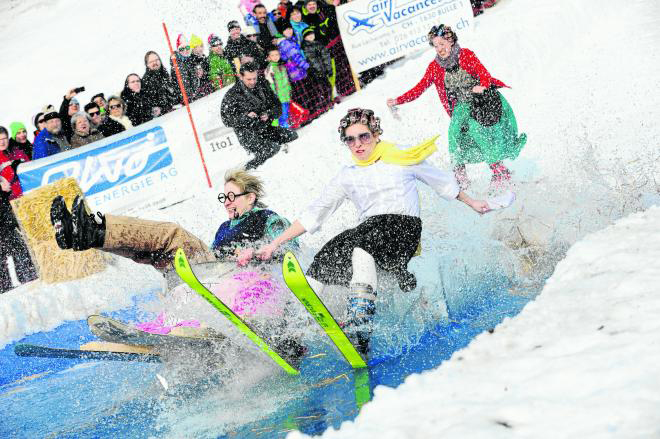 La prima è una gara strampalata dove i partecipanti devono tentare di superare una vasca riempita d’acqua (gelida!), posta alla fine di una rampa innevata. Per fare questo utilizzano dei trabiccoli autocostruiti nelle fogge più strane che dovrebbero (condizionale d’obbligo) scivolare più o meno sulla neve. Ammesso (e non concesso) che riescano a raggiungere la fine del trampolino senza capottarsi prima, nel 99% dei casi il tentativo si risolve in un non troppo piacevole tuffo nell’acqua ghiacciata tra le risa e gli scherni degli spettatori.