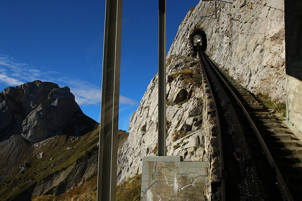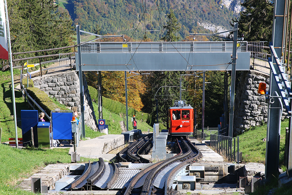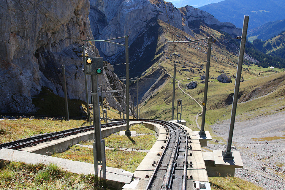 In arrivo all’incrocio di Ämsigen. In primo piano l’ingegnoso sistema di deviatoi. La piattaforma mobile si sposta per incastrare la sezione di binario adeguata [Foto: Giancarlo Scolari – Ferrovie.it]La velocità è bassa tra i 9 e i 12 km/h in salita e massimo 9 km/h in discesa. Inizialmente il treno attraversa un bosco e sale compiendo una larga curva verso sinistra fino a giungere alla stazione intermedia di Ämsigen. Man mano gli alberi lasciano il posto agli alpeggi del Mattalp per poi arrampicarsi lungo la parete dell’Esel che offre una vista impressionante sul vuoto fino alla vetta del Pilatus.