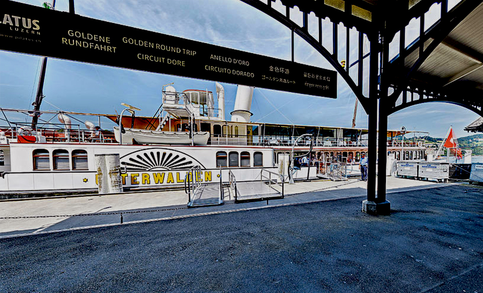 L’imbarco del battello a Lucerna. Prima tappa dell’Anello d’Oro [Foto Pilatusbahn]Una delle chiavi del successo del Monte Pilatus è che è ottimamente collegato a Lucerna. Con il nome “Goldene Rundfahrt” [Anello d’Oro] si intende un itinerario circolare con battello, treno, funivie e autobus che vede la stazione centrale della città lacuale come punto di partenza e arrivo.
