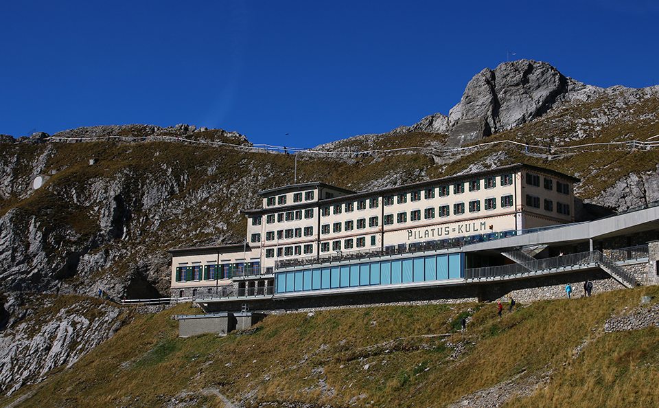 Lo storico albergo Pilatus Kulm. Qui soggiornò anche la regina Vittoria d’Inghilterra alla quale è dedicata la sala del ristorante [Foto: Giancarlo Scolari – Ferrovie.it]Alla stazione, sul plateau, si trova il famoso albergo Pilatus Kulm, insieme all’altro albergo Bellevue e alla galleria vetrata panoramica. Da qui partono diversi sentieri. In realtà il Pilatus è una piccola catena di tre cime ravvicinate: il Tomlishorn (2’132 metri), l’Esel (2’118 metri) e l’Oberhaupt (2’106 metri), tutte facilmente raggiungibili.