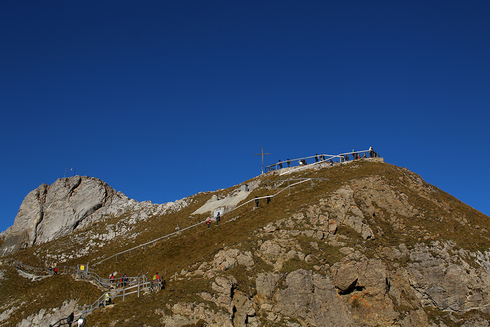 Il facile sentiero che conduce in vetta [Foto: Giancarlo Scolari – Ferrovie.it]Un sentiero conduce sulla vetta dove ci attende una splendida vista su 73 cime alpine tra le quali il Säntis in Canton Appenzell, l’Eiger, il Mönch e la Jungfrau nell’Oberland Bernese; su sei laghi e su panorami fantastici a 360° fino all’Alsazia in Francia e alla Foresta Nera in Germania. Il percorso più lungo, circa 35 minuti di cammino, passa dalla Valle dell’Eco e dal Sentiero dei Fiori. Un altro sentiero, chiamato Drachenweg è una galleria scavata nella roccia con tante finestre che e fa tutto il giro della cima.