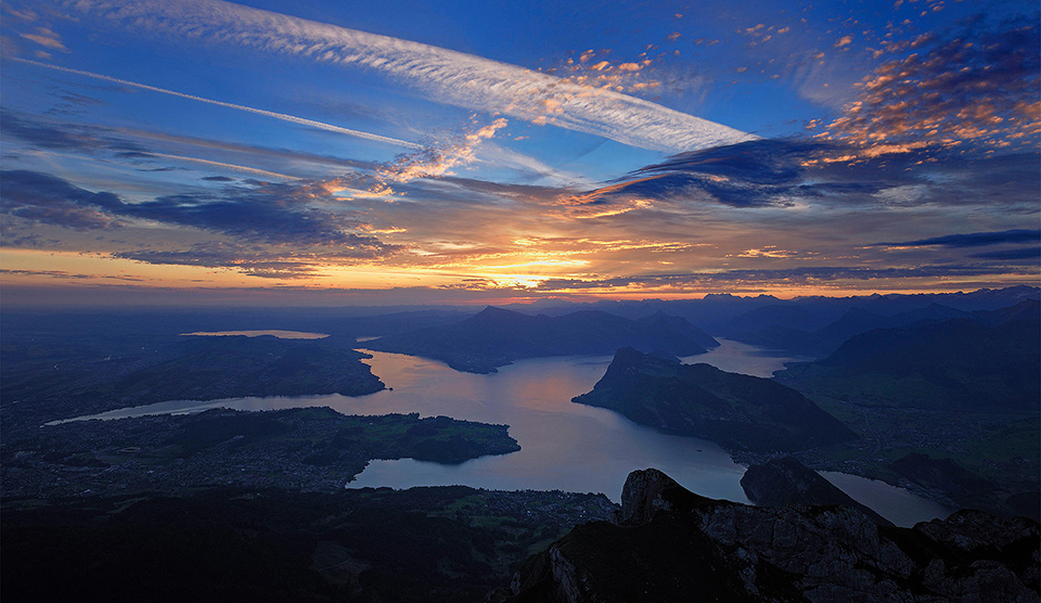 Un esempio dei meravigliosi panorami dal PIlatus: un tramonto romantico sul Lago dei Quattro Cantoni [Foto Pilatusbahn]Per scendere non è necessario riprendere il treno. Una moderna funivia, chiamata Dragon Ride (il dragone è il simbolo del Pilatus, legato ad antiche leggende) porta a Fräkmüntegg, prima tappa intermedia dove sono state ricavate una pista di bob estivo e un parco avventura. Una cabinovia porta poi a valle, a Kriens, passando dalla stazione intermedia di Krienseregg (dove c’è un parco divertimenti per bambini). Da Kriens si prende infine l’autobus n°1 per tornare a Lucerna.